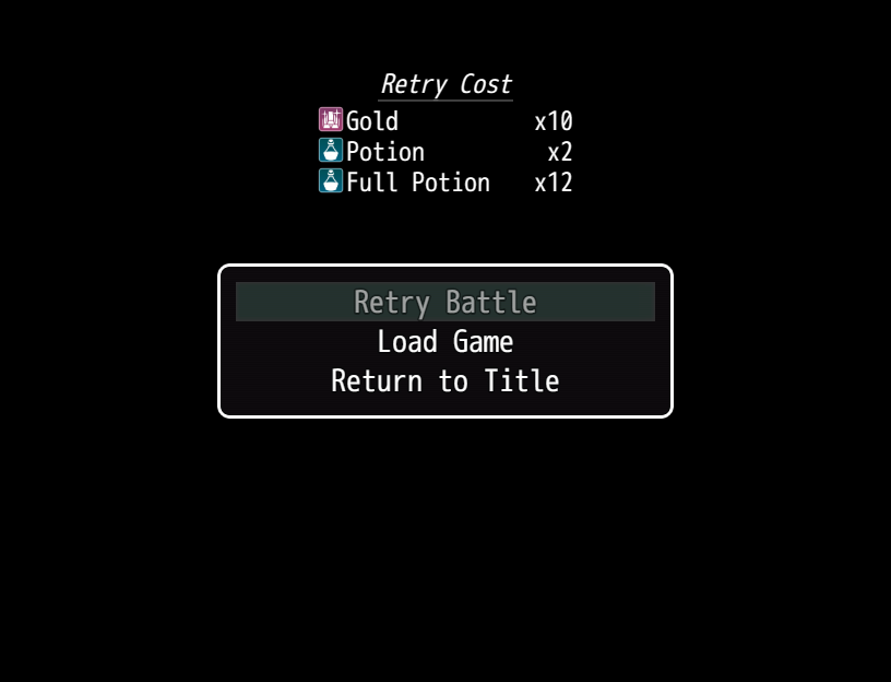 This plugin allows developers to setup specific costs for the Player to have to pay in order to retry a battle.