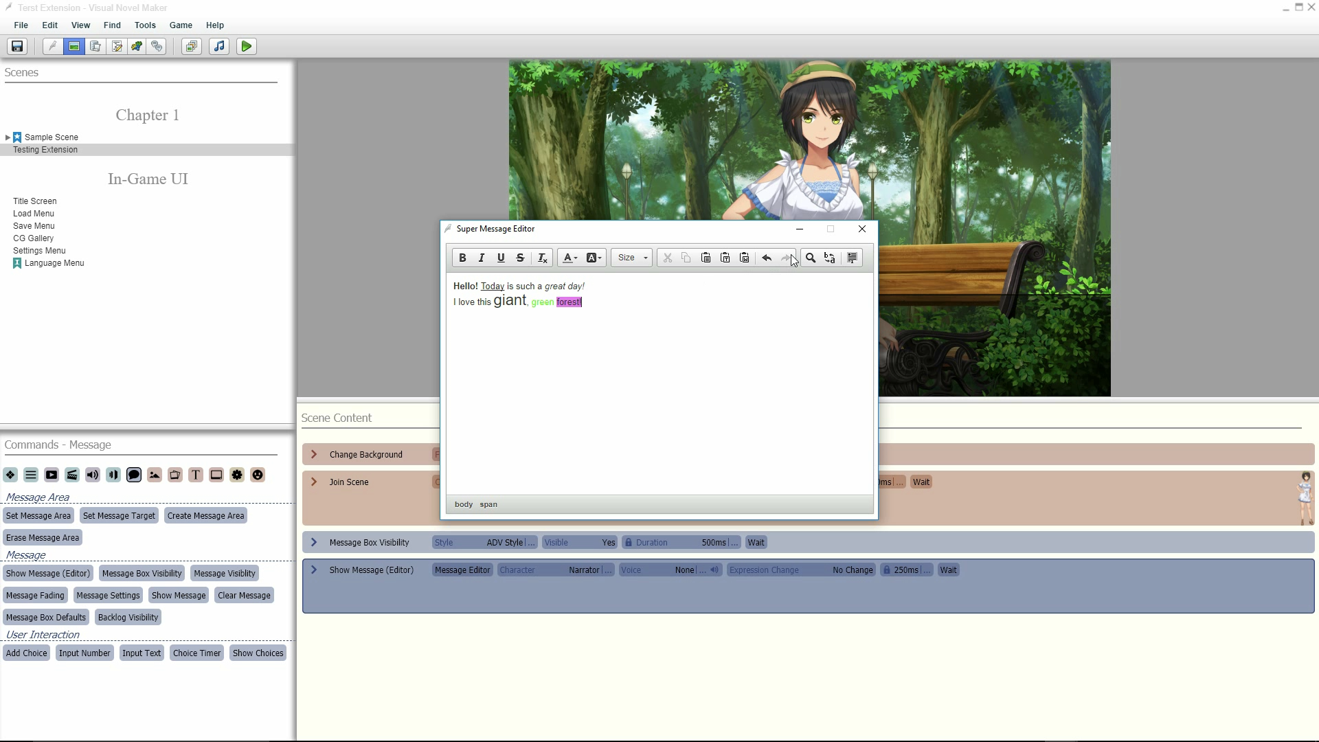 This is extension provides developers the ability to use a “wysiwyg” style text editor for creating Show Message commands.