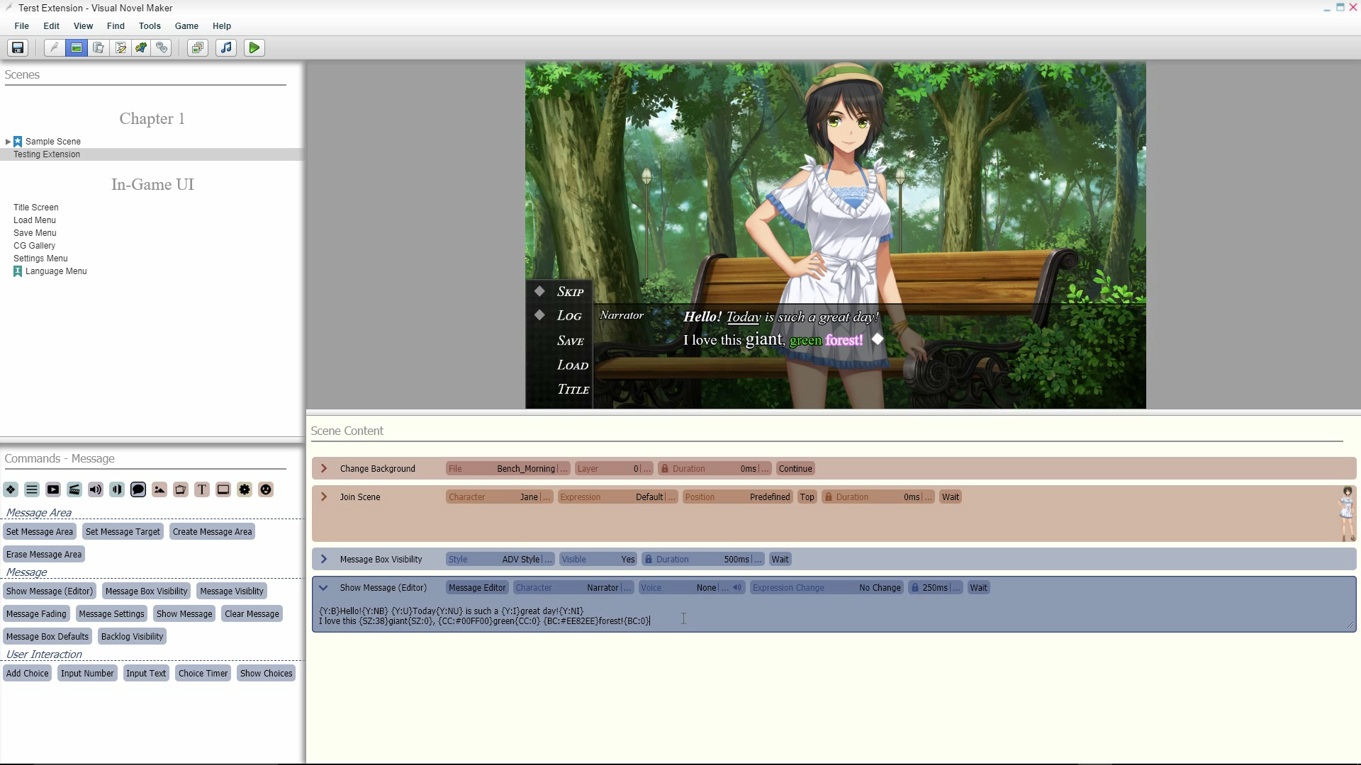 Upon opening the editor, any existing text will be loaded in. Compatible message codes will be translated to their proper effects while other text codes will remain unchanged. Once the user edits their message, they may simply close the window. The new text will be converted back into VNM message codes and placed into the command text box. Be sure to click the command box to view the updated changes!